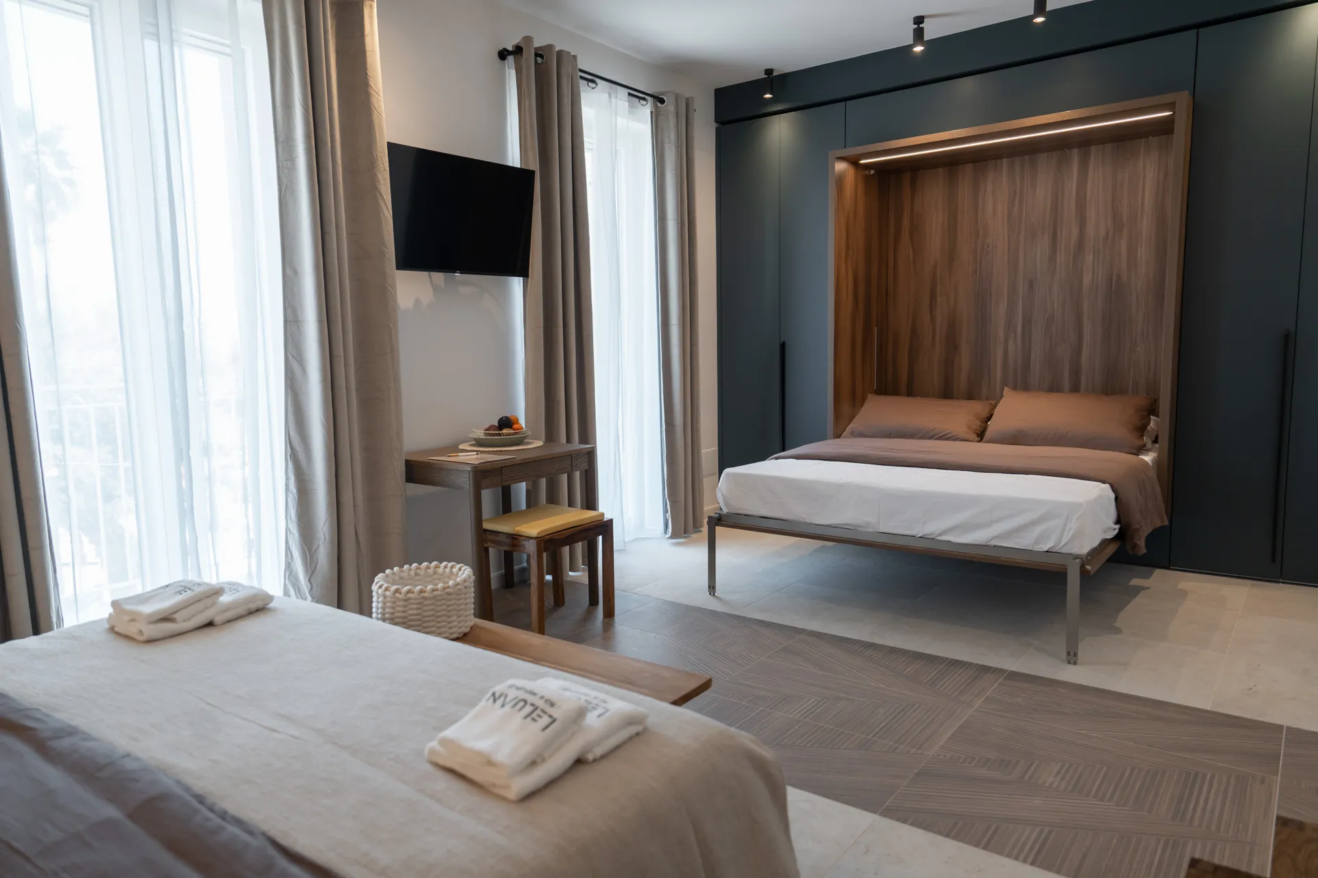 La nostra camera può essere configurata secondo le tue esigenze, fungendo da camera singola, matrimoniale, tripla o familiare. Questa soluzione flessibile è perfetta sia per coppie che per famiglie. Dotata di letti configurabili sia matrimoniali che singoli, la camera offre un ambiente open space con bagno privato. Camera equipaggiata di climatizzatore, Wi-Fi gratuito, Smart TV, mini-bar, e un bagno spazioso con cabina doccia, doppio lavabo, e asciugacapelli. La versione matrimoniale offre anche un accogliente zona lounge con una vista spettacolare sul mare, garantendo relax e tranquillità.